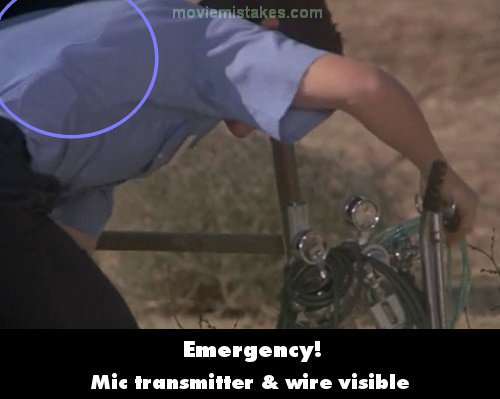 Visible crew/equipment: When DeSoto and Gage are trying to rescue the unconscious boy stuck in the tree, Gage drills a hole in the tree, and when he reaches down to the oxygen tank and then places the tube in the hole, the outlines of both the mic transmitter and wire are visible on Gage's shirt.