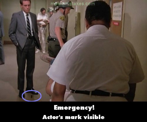 Visible crew/equipment: After Gage and DeSoto climb the ladder to get the dog off the roof the second time, when it cuts to Rampart there is a man waiting outside the treatment room, and the actor's tape mark is visible on the floor, at his feet.