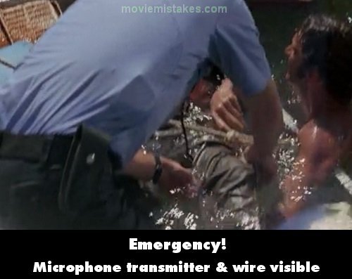 Visible crew/equipment: During the boating accident rescue, the outlines of the mic transmitters and wires are visible on the backs of both Johnny's and Roy's shirts, on their right sides.