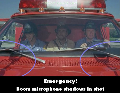 Visible crew/equipment: When Art, The Screenwriter, goes on his first ride-along with Squad 51, just as Art rambles on about the fire truck on its mission of mercy going 80 miles an hour, two shadows of mic/camera equipment are visible on the left and right side of Squad 51's hood. What's amusing is that a moment prior to this, Art actually says that they could mount a camera right on the hood of the truck, when they make the film about paramedics.