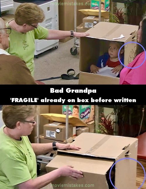 Continuity mistake: In the scene where grandpa is attempting to ship his grandson to his dad in a cardboard box, grandpa says to the two ladies who are objecting to his requests "well give me a pen, and we'll write FRAGILE on it." Shortly before he says that, the box already says "FRAGILE" on the right hand side, and then 2 seconds later the writing has disappeared. (00:31:10 - 00:32:15)