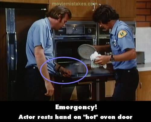 Other mistake: When Johnny prepares Chef Michel's recipe, he leaves the casserole dish in the oven while Station 51 is dispatched to the structure fire. When he and Roy return, Johnny opens the hot oven door to find it smoking and the dish bubbled over, and even though the oven door is supposedly very hot, Roy places his hand on the inside of that door and actually leans on it like there's absolutely no problem.