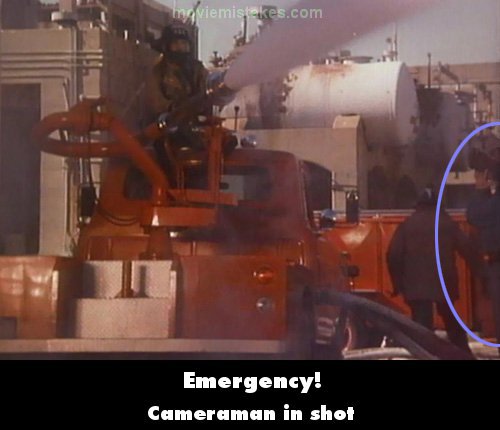Visible crew/equipment: At the site of the major chemical leak, after Johnny falls from the pipes and Roy lifts him up, a couple of shots later there is a medium shot of one of 105's guys on Deluge 105 pumping out water, and we can see a cameraman (filming Deluge 105's closeups that we see during this scene) holding a handheld on the right of the screen, behind the pillar.