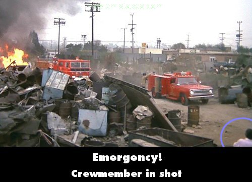 Visible crew/equipment: When Station 51 arrives at the salvage yard's fire, Johnny gets out of the squad, and when he puts on his turnout coat as the camera zooms out, a dark haired crew member wearing a short sleeve white shirt is visible at the lower right corner of the screen.
