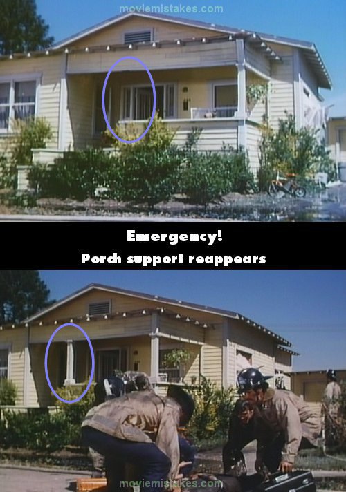 Continuity mistake: When Station 51 is at the scene of the oil well eruption, underneath a house which was built atop an abandoned oil field, just after Johnny tells Roy that he thinks the whole foundation is slipping, it cuts to a shot of the front porch as one of the porch columns (and part of another) breaks and falls. However, when the guys finally free the trapped man and carry him out, all the columns are upright once again.