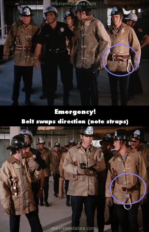 Continuity mistake: When Roy and Johnny are at the construction site with the guy who wants to jump, before Roy walks over to him we see the pompier belt around Johnny's waist has the carabiner hook to his left and the double tongue buckles to his right. Then when Captain Stanley tells Johnny to try and get to the guy from the other side, Johnny's belt is now around his waist the opposite way. In the following shots his life belt flips around a couple more times. Note that their pompier belts have at one side double leather straps which are the two tongue buckles, and the other side has a single strap of leather for the attached carabiner hook.