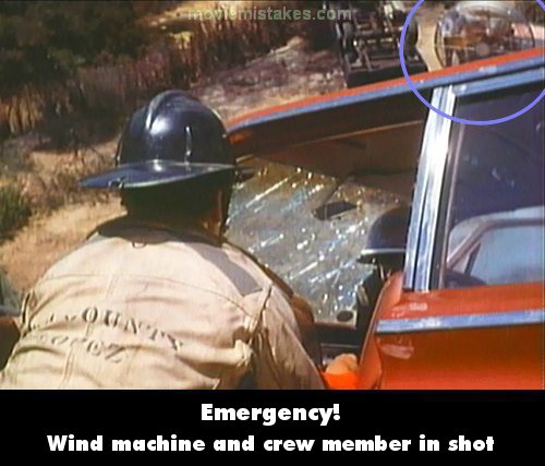 Visible crew/equipment: When Station 51 is on scene at the vehicle accident in the canyon, after Marco uses a crowbar to free the driver of the station wagon and he pulls the driver out, a crew member standing behind the FX 6-ft wind machine fan (to blow smoke) are visible in the background beside the other overturned car. As an aside, in the previous and following shots that crew member and wind machine fan are in the same spot where Chet and Johnny supposedly are.