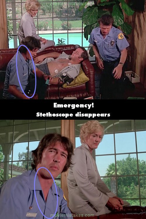 Continuity mistake: When Johnny and Roy are with the heart transplant patient who is having chest pains, after they contact Rampart, in the wide shots Johnny has the stethoscope around his neck, but in his closeups the stethoscope is gone.