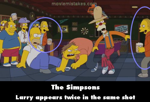 Revealing mistake: When Homer is riding Barney like a bull at Moe's, there are duplicates of Sam and Larry (the barflies) in the same shot.