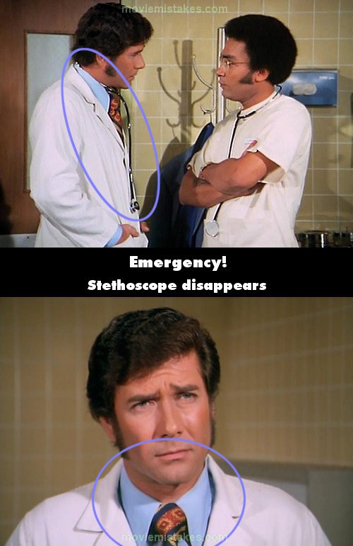 Continuity mistake: After Brackett gets off the phone with Dr. Meier, he walks back to treatment 1, and when Brackett speaks to Morton about the patient being on warfarin, the stethoscope around Brackett's neck vanishes in his closeups, and reappears in wide shots.