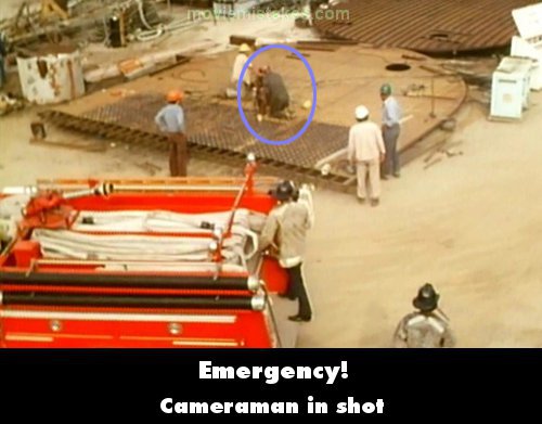 Visible crew/equipment: After Station 51 is dispatched to the fire at the marine salvage yard, when they arrive at the scene we can see a second cameraman on his knees beside the camera, as he is shooting footage of the ship from that specific angle, which we see during this scene.