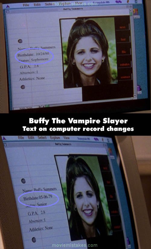Continuity mistake: Buffy's birthdate starts at 1979. In "I Robot, You Jane", when the demon pulls up Buffy's file in the school system, it shows her year of birth as 1980 and her year as sophomore. But when her file comes up on the student's computer screen, it's changed to 1979 and that she is a senior. It wasn't until towards the end of season 1 in "Nightmares" that her birth year is 1981 (on her tombstone before she comes out as a vampire). (00:08:30)