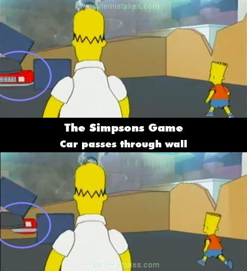 Revealing mistake: Invasion of the Yokel Snatchers: On the Wii version, just as Homer and Bart are about to be sucked into the spaceship, a car on the ground can be sticking through part of a damaged wall. As Homer and Bart are sucked into the ship, the car then lifts out of the ground and fades through the wall without damaging it.
