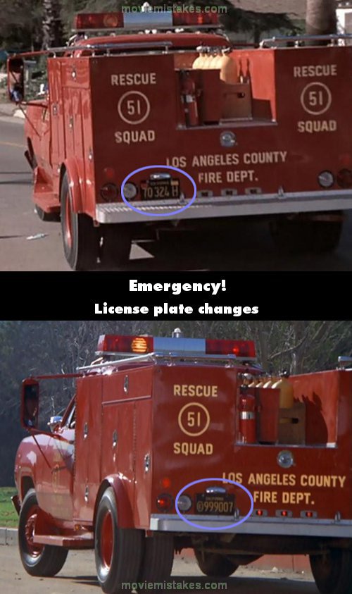 Visible crew/equipment: When Squad 51 is dispatched to 'person caught in a mailbox', have a look at the squad's license plates when it rolls up on scene. The plates read "70324H" which is the California commercial plate number for Squad 51, not the usual prop dept's license plate "E999007." It was the prop dept's responsibility to change from the commercial plate to the prop plate, but this scene slipped by them. It's also interesting to notice that this scene takes place at a real intersection up the block from Universal Studios, which is the direction Squad 51 came from. Note the "Black Tower/MCA Tower" in the background, which houses Universal's executive offices.