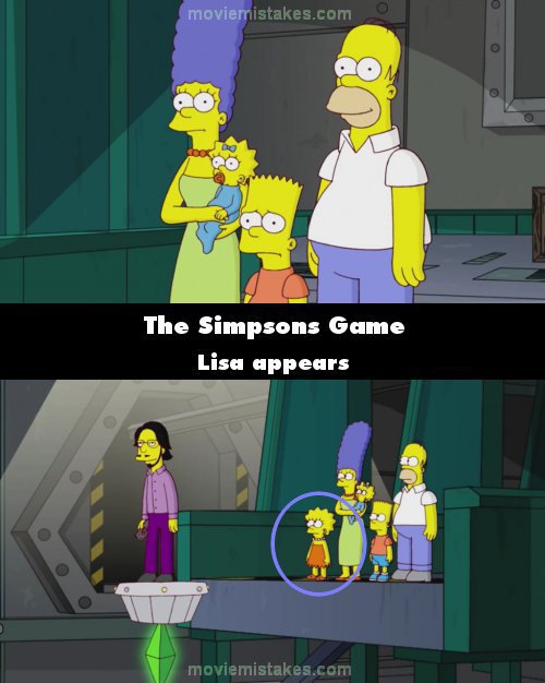 Continuity mistake: Bargain Bin: Throughout the opening cutscene inside the Game Engine, all five Simpsons are shown together, but in the shot where Bart says "And poorly rendered" and Marge says "Which one is supposed to be me?", Lisa has vanished and reappears in the next shot.