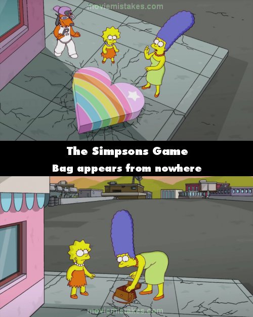 Continuity mistake: Grand Theft Scratchy: A bag with the key card suddenly appears as the woman in blue is crushed by a heart.