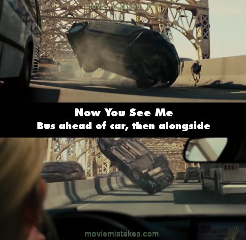 Continuity mistake: When the car crashes on the bridge, it slides against the barrier on the middle of the road and flips over. As it slides, the bus on the next lane is seen to be more ahead of the car. The shot then cuts to Fuller yelling out "Oh, shit!" and it cuts back to he car flipping over. Only now, the bus is suddenly right next to the car, ready to drive past it. (01:23:50)