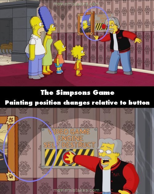 Continuity mistake: Five Characters In Search Of An Author: When Matt Groening unveils the Game Engine self destruct button, the painting hiding it changes position in relation to the self destruct button between shots.