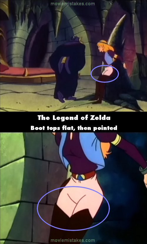 Continuity mistake: In the scene following where Link talks to the Witch of Walls, Ganon has Zelda tied up in his bedroom. The first shot showing Zelda, the tops of her boots are flat and level. But then it cuts to a close up of her that pans up from her legs and suddenly the top of her boots are pointed. (00:11:00)