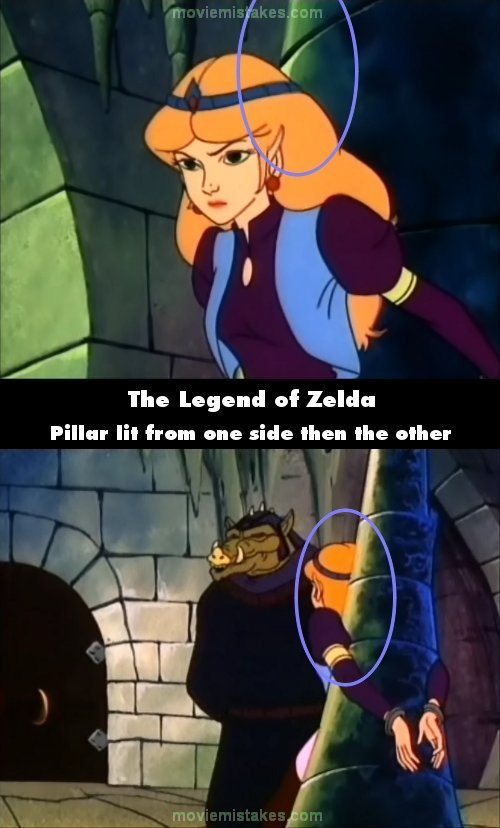 Continuity mistake: The close up of Zelda chained to a pillar in Ganon's bedroom shows that the light is hitting the pillar from the side or Zelda's right side. When it cuts to a shot from behind Zelda, the light is hitting the pillar from her left side. (00:11:05)