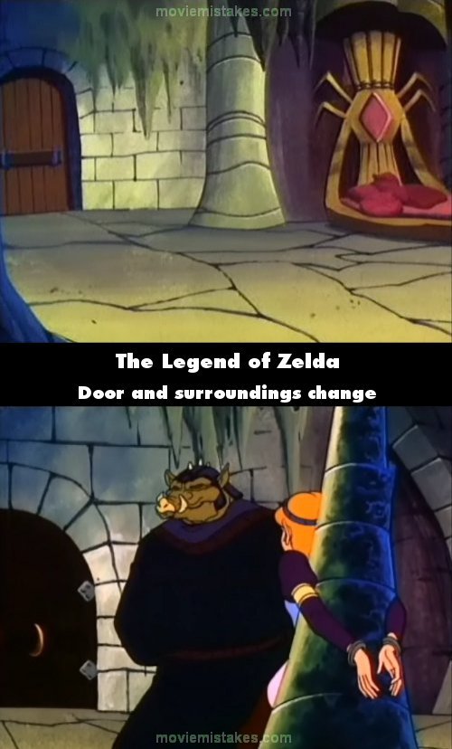 Continuity mistake: When the scene starts where Ganon has Zelda chained up in his bedchamber, the first shot pans by showing the door to the room. It is a light brown with a single bar across the front. A little bit later when Ganon is taunting Zelda to give him a kiss, the door is shown again, but this time a much darker brown, with no bar, and a gold handle appears on it. The stones around the door also slightly change, and the moss hanging by the door becomes paler and moves away from the door, and the column vanishes. (00:11:00)