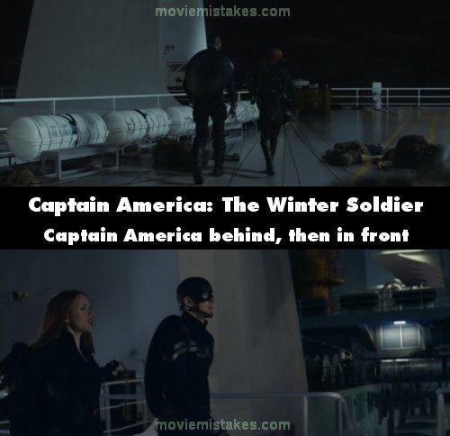 Continuity mistake: After Steve has taken out all the terrorists guarding the boat, the other SHIELD agents land on the boat in parachutes. As soon as Romanoff lands on the boat, she continues walking with Steve and begins conversation. From the reverse angle, Romanoff is visibly in front of Steve, but from the sudden following shot from the side, she is suddenly standing behind him. (00:06:55)