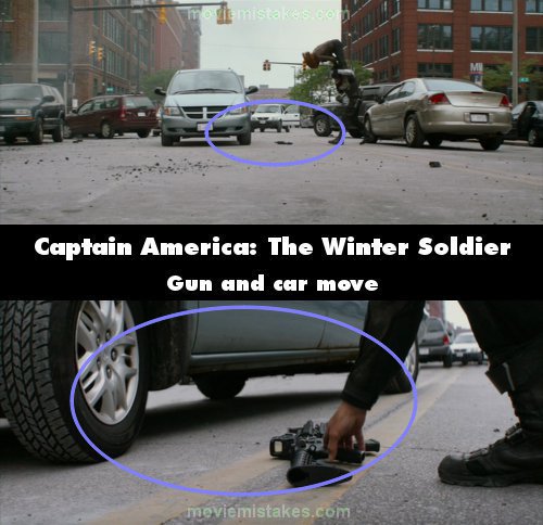 Continuity mistake: After the Winter Soldier blows up the car he assumed Romanoff was hiding behind, she sneaks up behind him and kicks the gun out of his hand. When he throws her at one of the cars, the gun is on the road to the left of some yellow lines, next to a car. A few shots later, when the Winter Soldier picks up the gun, the gun and car have both moved - the gun is now right on the lines, the car is still the same distance from it. (01:18:00)