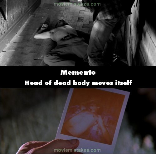 Deliberate mistake: When Leonard snaps a picture of Jimmy's body his head is lying between his shoulders looking straight up, but in the polaroid his head is lying to the right, and it is, in fact, a different actor altogether. (01:39:10)