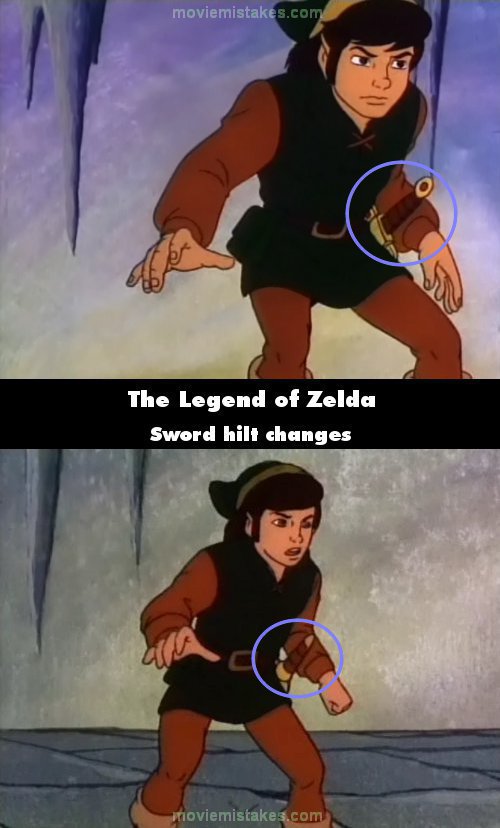 Continuity mistake: After Link is turned back into an elf by Spryte's kiss, he stands up and draws his sword. Before he draws it, the shot changes a little to show the action. But several things change in that small cut. The handle on Link's sword changes up, his finger nails vanish, his left hand is suddenly balled up, and some of the moss on the wall behind him moves. (00:13:35)