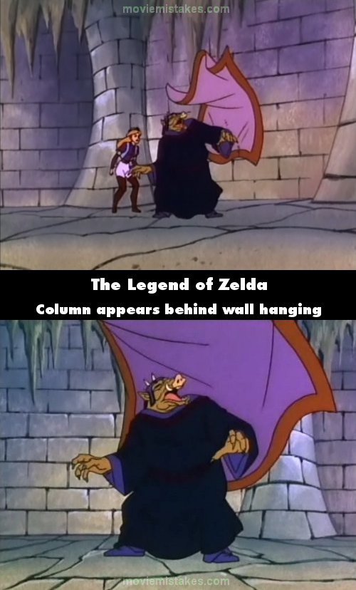 Continuity mistake: Once Link is returned to normal by Spryte's kiss, her draws his sword and fires a laser at a rug on the wall behind Ganon. It is on a flat wall and begins to fall, but the camera cuts to a closer angle and suddenly the spot directly behind Ganon where the rug fell from has a column in the wall. (00:13:40)
