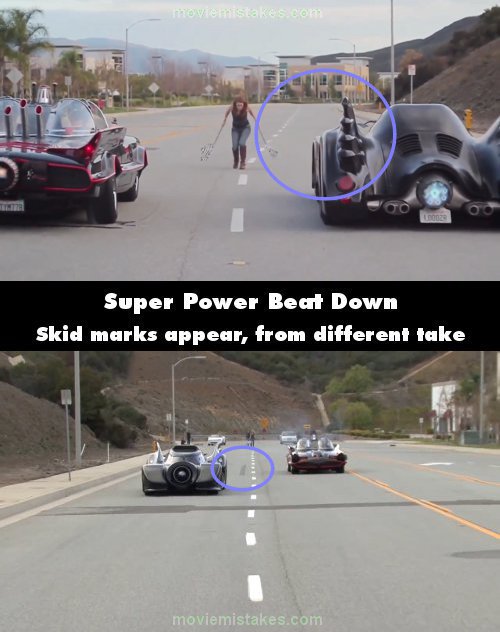 Revealing mistake: When Marisha waves the flags to start the race, you can see the road behind her is clean. But once the cars get past her and it cuts to a view from in front of them, suddenly there are skid marks on the road in the lane where the '89 Batmobile is. The marks are not lined up with the car at that moment, so they are from previous takes of the race. (00:08:00)