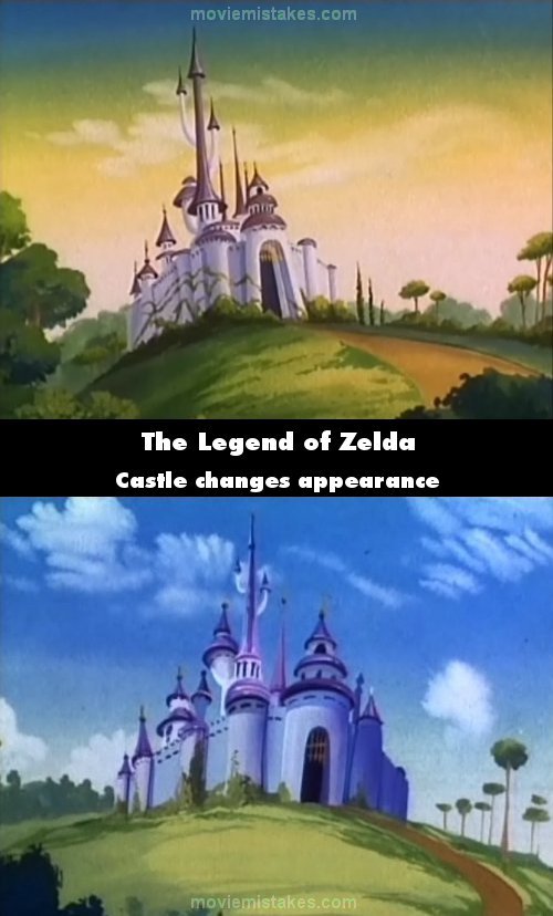 Continuity mistake: The episode begins with the opening shot of Hyrule Castle, and also ends on a shot of Hyrule Castle. In the opening shot and then in the ending shot, the castle has changed up a bit. Most noticeably the vines on the side of the castle have vanished. The bushes around the walls of the castle have lessened. The trees around the castle have also changed. Also the number of windows above the entrance of the castle decreases, and most of the towers change in size and shape. Also an extra pointed tower appears on the right side. And finally the road leading to the castle becomes much more narrow. (00:00:45 - 00:15:05)