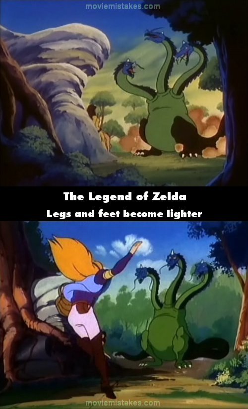 Continuity mistake: When the three headed dragon is shown shaking his heads as he is taunting the girl, his body is mostly light green, but his legs are dark green. But a minute later when Zelda dodges a flame attack by the dragon and lands in front of it, it's legs and feet are now the light green color. (00:01:25 - 00:02:25)