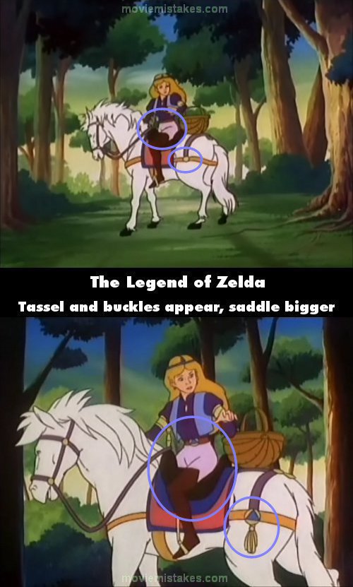 Continuity mistake: Zelda brings her horse to a stop and then reaches for an apple to throw at the dragon. When doing so, it cuts to a close up of her on the horse, and suddenly, a tassel appears on the horse's butt where the strap is, a blue triangle appears on the buckle of the same strap, an extra layer of blue appears under Zelda's saddle, and her belt buckle suddenly appears. (00:01:20)
