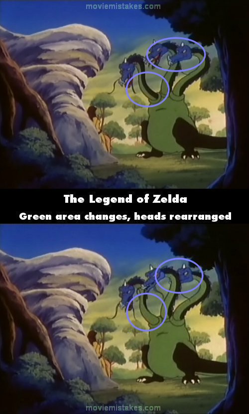 Revealing mistake: On the three headed dragon, once the middle head starts talking about how the girl looks good enough to eat, the head on the right (our perspective) suddenly passes through the neck of the middle head. In the same moment, the light green area on the left head's neck suddenly increases towards the base, making the dark green area disappear. (00:01:30)