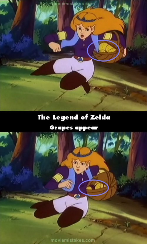 Continuity mistake: After Zelda gives the middle head of the dragon heart burn from a grapefruit, he blows fire at her and she jumps and dodges it. The shot changes and she rolls to her feet, and if you watch her basket, all that is visible in it are grapefruits as she is begins sitting up. But as she sits up, some regular grapes just suddenly materialize between the grapefruits. (00:02:30)