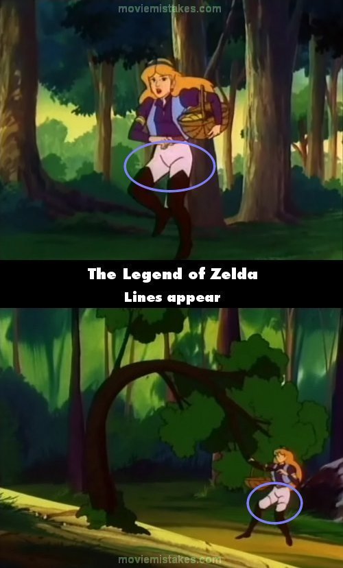 Continuity mistake: When Zelda back flips to the tree and then slides her basket onto it, a shot showing her push down the tree has her suddenly have some black lines on her legs just above her knees that are only there in that shot, and nowhere else in the episode. (00:02:55)