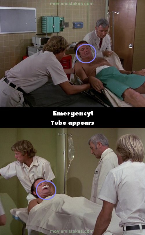 Continuity mistake: When the guy (Michael Conrad) with the gunshot wound is being wheeled out of the treatment room there is nothing on his face, but in the shot from the hallway as they exit the room suddenly he has a tube inserted into his nostril with tape holding it in place.