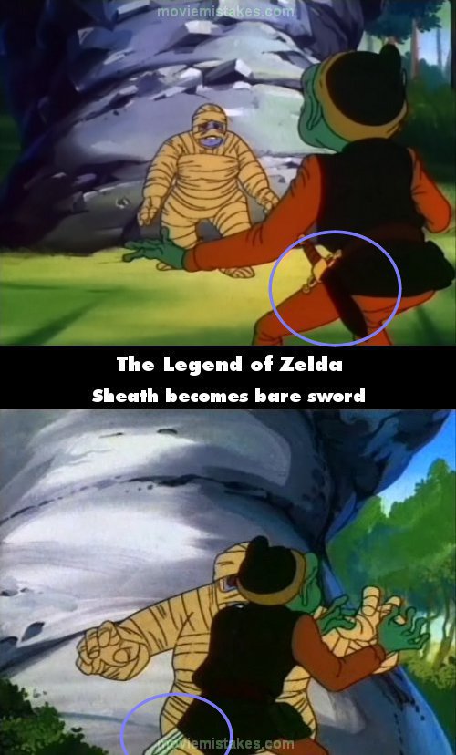 Continuity mistake: When Link is turned into a frog, you can see that his sheath is still brown like before as he pushes the mummy away from him. But then as Zelda is tackling him out of the way of the mummy's attack, the sword is still at his side but suddenly without a sheath. A bush also appears next to the rock behind the mummy. (00:05:40)
