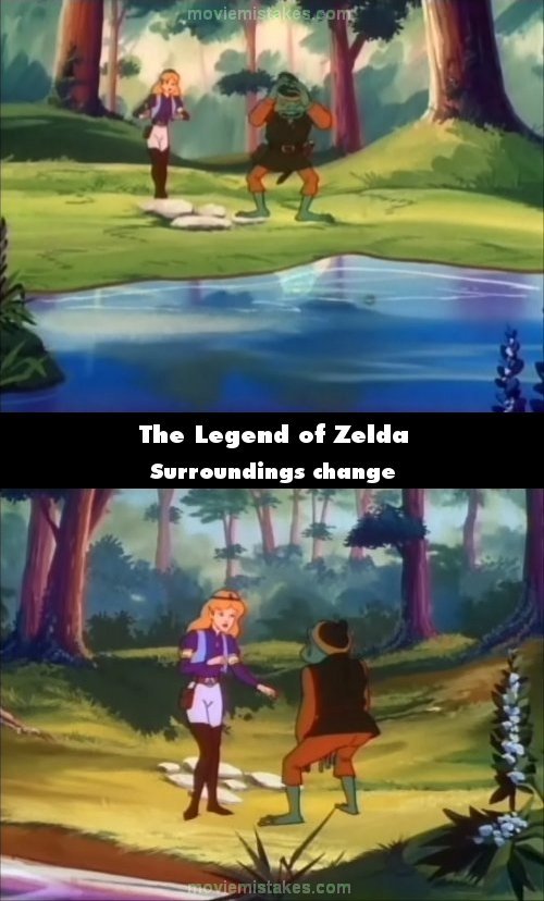 Continuity mistake: After Zelda apologizes to Link for how he looks, Link says he is a monster and can never face anybody again. The shot pulls back to show the pond they are around again, and suddenly the rocks they were standing by go from 4 to 6, the ‘beach' like spot around the pond increases (no tides, it's a pond), and the general hills and shape of the land all around changes shape. (00:06:45)