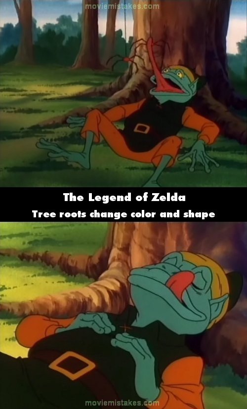 Continuity mistake: Link awakes in his Frog form and sees the Red Dealers dangling in front of him and then eats them, his head resting against the tree. When the shot cuts closer as he lays back in satisfaction and licks his lips, the size of the tree roots above the ground shrinks. And then they change size yet again in the very next shot. (00:08:00)