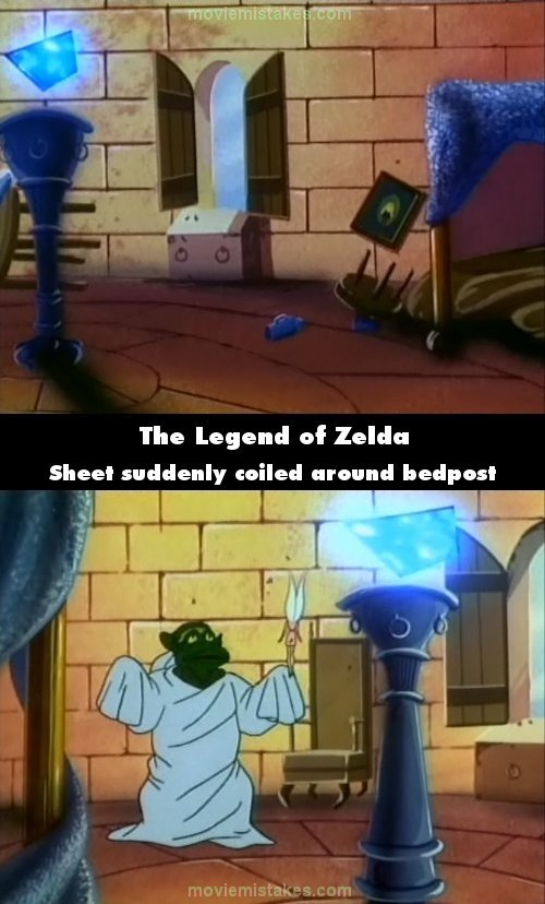 Continuity mistake: When Link's room is first shown as Spryte is looking for it, the camera pans by his bed and shows a blue sheet draped over the bed post and the top of the bed, but only that way. A bit later the camera cuts to a different view from the opposite side of the bed post and now the sheet is coiled and wrapping around the post much further. (00:08:35)