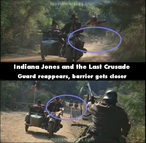 Continuity mistake: When Indy and his father are being pursued by German soldiers on bikes, right after they break through the barrier, the barrier guard comes out of his post and waves the pursuing German soldiers to slow down in the background. In the next shot he's no longer there, and the barrier's quite far away, then in the following shot he's back, and Indy's not so far from the barrier again. (01:04:35)