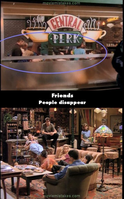 Continuity mistake: Toward the end of the episode, the exterior shot of Central Perk shows about 8-10 people inside the cafe, at the coffee bar, at the tables. But the next interior shot shows the cafe is empty except for our six Friends, lounging in the closed cafe while Rachel cleans up. (00:12:15)