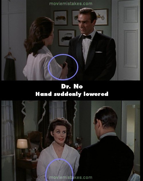 Continuity mistake: Bond enters his room and spots Sylvia Trench playing golf. As they talk, she raises the golf club. When the angle changes, she holds it down and raises it again. (00:15:10)