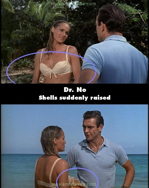 Continuity mistake: When Honey is with Bond on the beach, she is holding two shells by her chest and lowers them when she is talking to him. But when the camera angle changes to behind Honey in the next shot, she is now holding the shells by her chest again. (01:01:45)