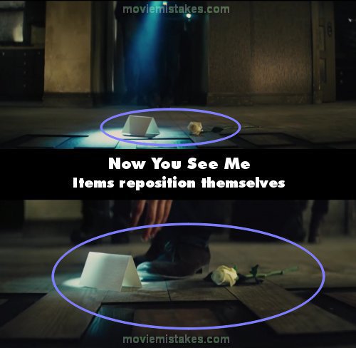 Continuity mistake: When the Horsemen discover the "Now You Don't" card, the first shot shows the edge of the card to be resting on the lining on the floor. When Daniel picks the card up, almost half of the card is shown to be resting on the lining in the floor. The same goes for the rose. (00:12:35)