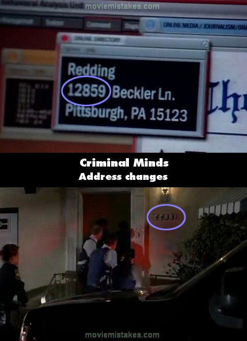 Other mistake: When Garcia tracks down Peter Redding's current address, we see a close-up of Garcia's computer screen and the address reads "12859 Beckler Ln.," but when the BAU and police arrive at Peter's house the number is 4433.