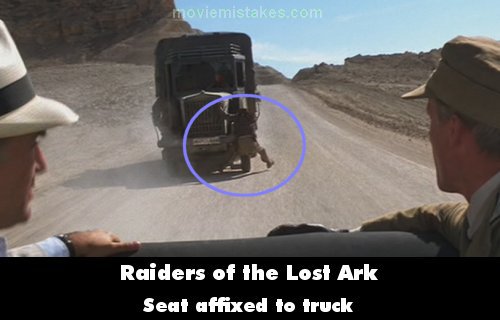 Revealing mistake: During the truck chase scene, Indiana is thrown or forced over the front of the bonnet and almost run over. There is a wide camera shot, and while holding on to the front fender, Indiana can be seen sitting on a chair which is attached to the truck. (01:27:40)