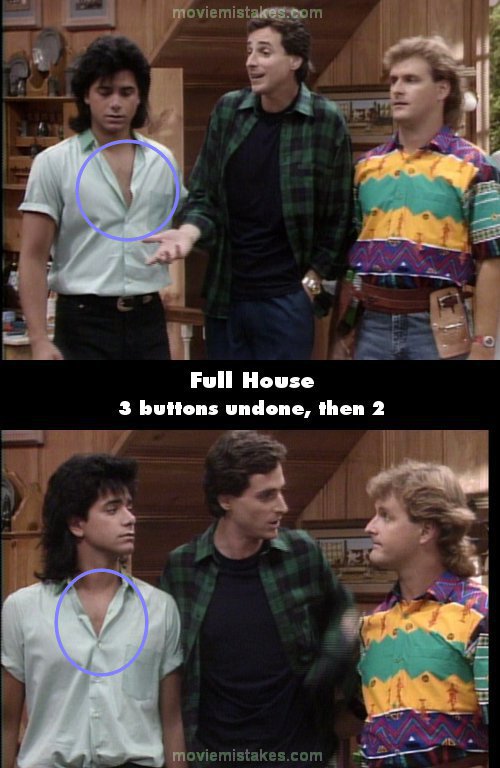 Continuity mistake: Near the end of the episode in the shot where Danny says "OK, so we had a little help," the top three buttons of Jesse's shirt are unbuttoned. The camera switches to a shot of their moms and then back to the guys. In this shot, only the top two buttons are unbuttoned.
